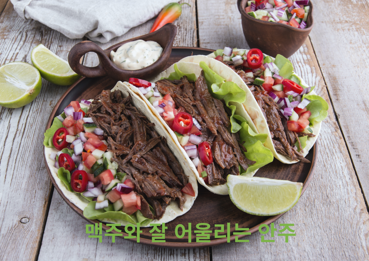 촉촉한 고기와 신선한 채소, 그리고 매콤한 소스가 어우러진 타코는 맥주의 청량감과 완벽한 조화를 이루며, 다양한 맛을 즐길 수 있어 맥주를 더욱 맛있게 만들어 줍니다.