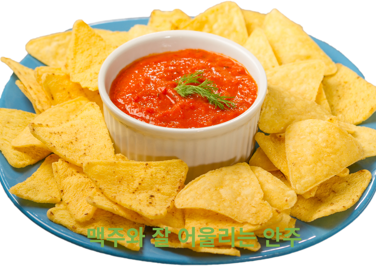맥주를 즐길 때 빠질 수 없는 나초와 살사 소스! 바삭한 나초와 톡 쏘는 살사 소스는 맥주의 쌉쌀한 맛을 한층 더 돋워줍니다.